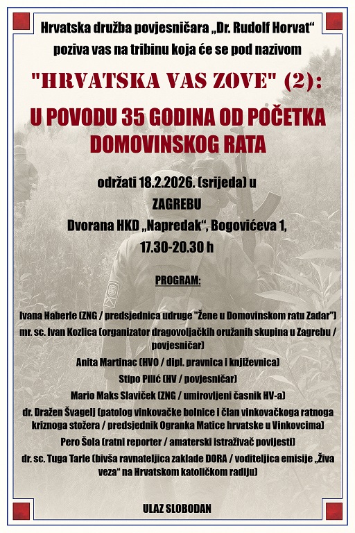 U povodu 35 godina od početak Domovinskog rata, Hrvatska družba povjesničara „Dr. Rudolf Horvat“ organizira seriju tribina pod nazivom „Hrvatska vas zove“.