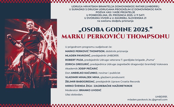 Najuspješnijem hrvatskom domoljubnom pjevaču Marku Perkoviću Thompsonu u ponedjeljak, 29. prosinca 2025. u 11 sati u dvorani HVIDR-e u Zagrebu, Slovenska 21, hrvatski branitelji će svečano uručiti svoje tradicionalno priznanje – „Osoba godine“.